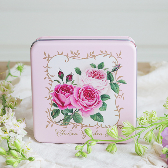 オールドローズのブーケをデザインした缶にバラの香りの紅茶